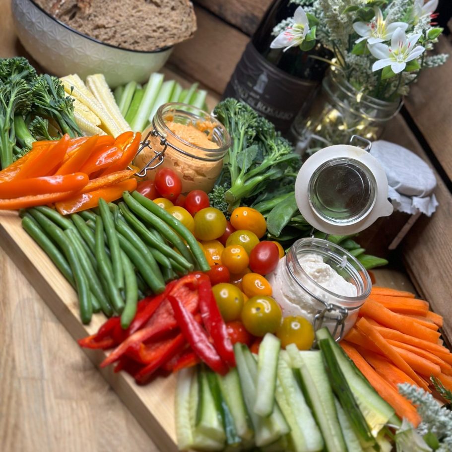 A vibrant and refreshing crudité grazing board, featuring a selection of six freshly sliced vegetables, perfect for dipping and snacking. Accompanied by creamy red pepper hummus and classic hummus, this board offers a light and healthy option for any occasion.