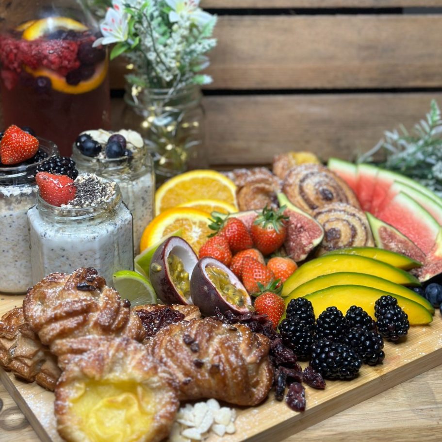 Start your day right with our Breakfast Grazing Board, a delightful spread of wholesome and delicious treats. Enjoy a colorful selection of vibrant fresh fruit, alongside freshly baked mini Danish pastries for a sweet touch. Indulge in our creamy Vanilla and Chai Seed Oats, made with your choice of almond milk or dairy milk, and snack on a variety of nuts and dried fruits to round off the perfect breakfast experience.